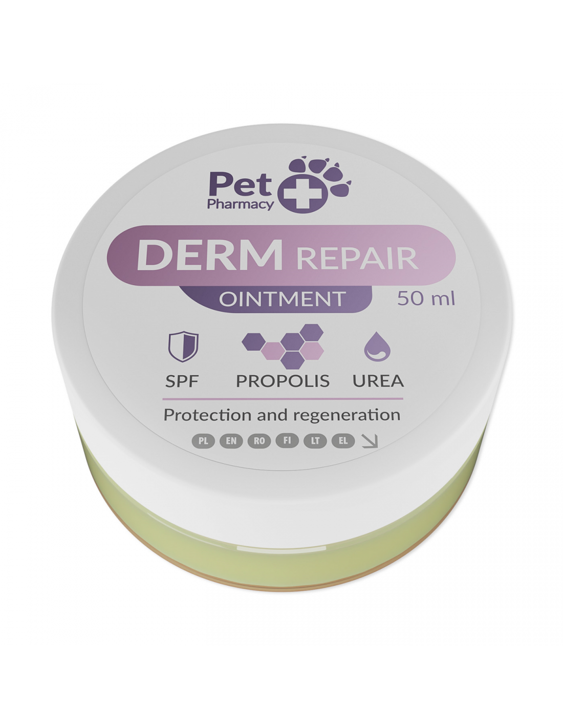 Descrizione: Derm Repair è un unguento protettivo e rigenerante sviluppato per la cura della pelle di cani e gatti. Grazie ai suoi ingredienti attivi, crea una barriera protettiva sulla pelle, riducendo l'impatto di fattori esterni dannosi. Il prodotto ha proprietà antibatteriche, antifungine e antinfiammatorie ed è ideale per la rigenerazione delle zone secche, screpolate o callose.